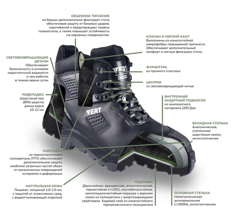 Обувь серии VERT 3000 — безупречное сочетание стиля, комфорта и современных технологий! Коллекция отличается стильным дизайном, использованием высококачественных современных материалов и уникальной колодкой повышенного комфорта. Анатомическая стелька помогает минимизировать утомляемость и обеспечивает отличную поддержку стопы даже при длительной носке. Обувь серии VERT 3000 гарантирует надежную защиту от агрессивных сред и механических воздействий, что делает ее идеальным выбором для работы в самых разных отраслях промышленности. Высокие стандарты качества и технологичные решения обеспечивают безопасность и комфорт в любых условиях. VERT — защита и стиль без компромиссов! Состав материалов: -Верх: натуральная гладкая лицевая кожа (толщина 1,8 - 2,0 мм). -Клапан-язык: глухой из микрофибры, с водоотталкивающей пропиткой и с полиуретановым покрытием, продублирован поролоном. -Мягкий кант: из микрофибры, с водоотталкивающей пропиткой и с полиуретановым покрытием, продублирован поролоном. -Материал утеплителя: ше