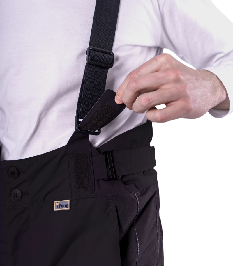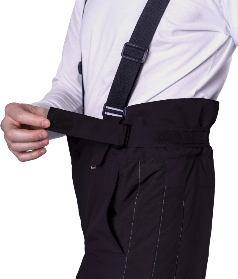 • высокий утеплённый пояс с застёжкой на две пуговицы. Объем пояса регулируется в области боковых швов с помощью хлястиков с застежкой текстильной и держателя с двухщелевой пряжкой