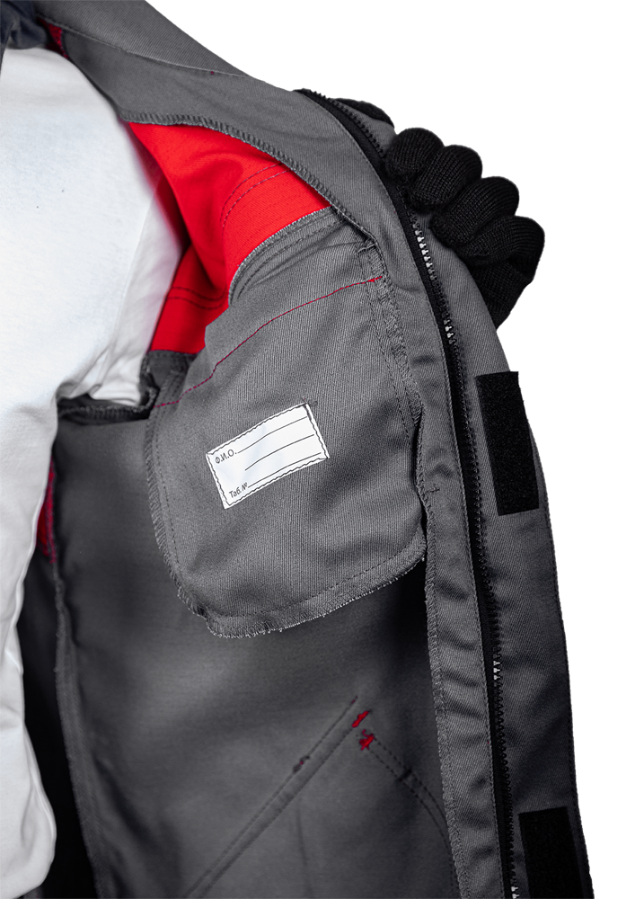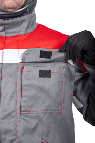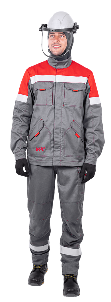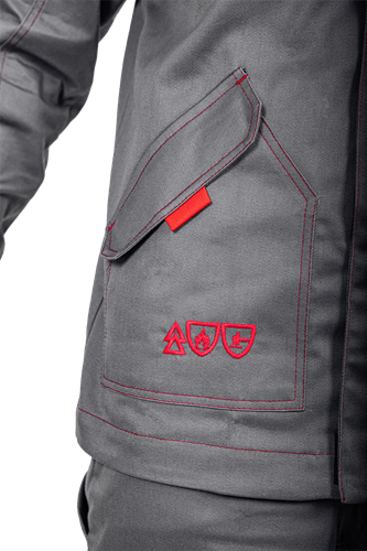 Уровень защиты: 3 То -(А1 и А2) от кратковременного воздействия открытого пламени Тт (уровень защиты В1) – защита от повышенных температур, от конвективной теплоты Ти (уровень защиты С1) – защита от повышенных температур, от теплового излучения Эс - от статического электричества Ми – защита от механических воздействий, истирания З – защита от общих производственных загрязнений Материал: огнезащитная ткань WORKER 265E Состав: 87% хлопок / 12% нейлон / 1% антистатическая нить, плотность 265±5% г/м2 Комплектность: куртка, брюки. Куртка прямого силуэта, с центральной бортовой застежкой-молнией, с цельнокроеной планкой с застежкой текстильной. Воротник - стойка. Ветрозащитная (внутренняя) планка имеет шевроном с напоминающей информацией «Застегни молнию! Застегни клапан!» Полочка с верхним и нижним накладными карманами с клапаном с застежкой. Правый верхний накладной карман имеет дополнительное отделение. По шву притачивания кокетки спинки и полочки ра