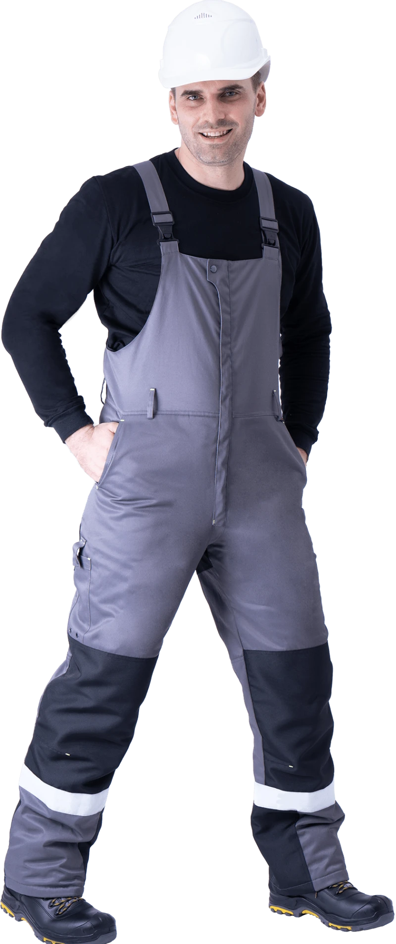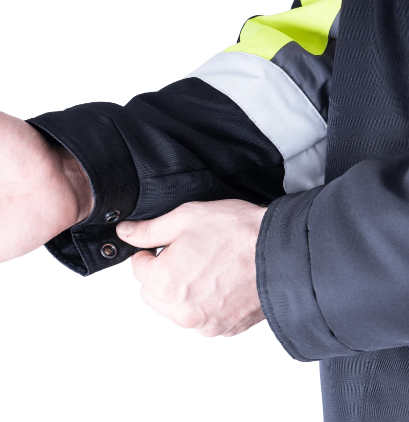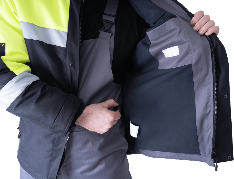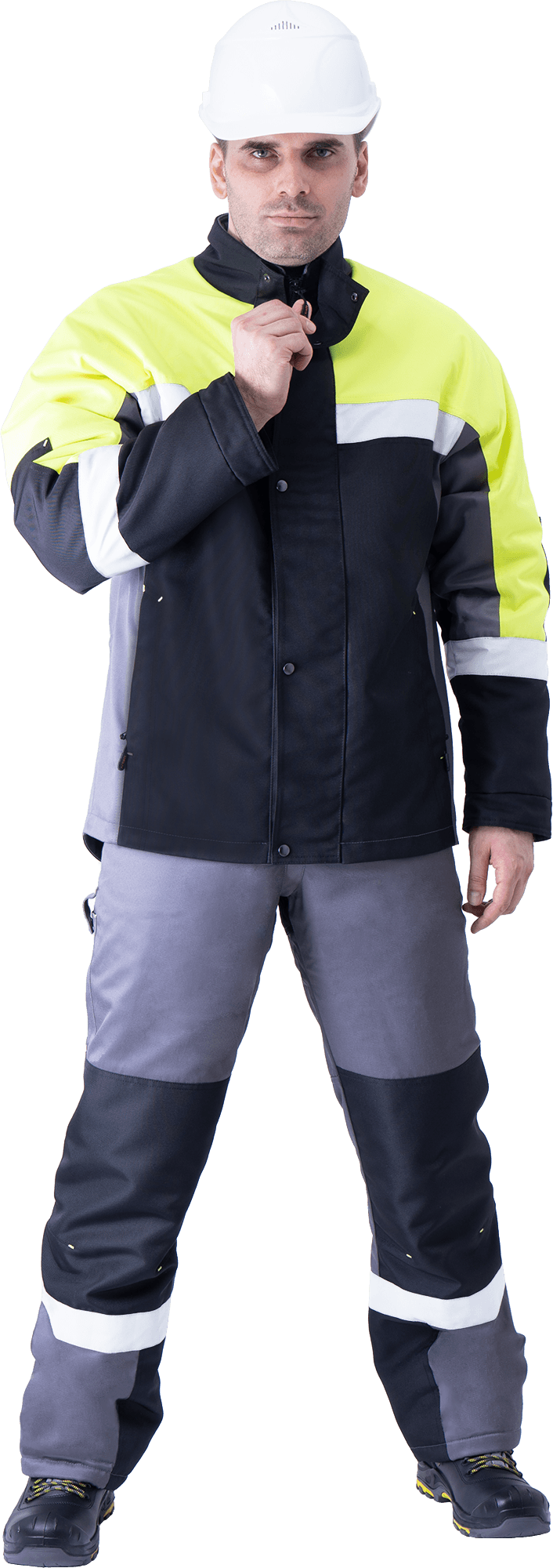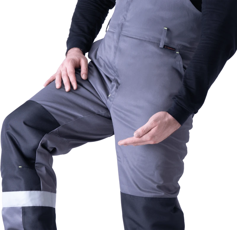 Костюм мужской ЛОГГЕР ПРОТЕКТ от механических воздействий (в т.ч. ручной цепной пилой) и ОПЗ (куртка, полукомбинезон), серый-черный-лимонный