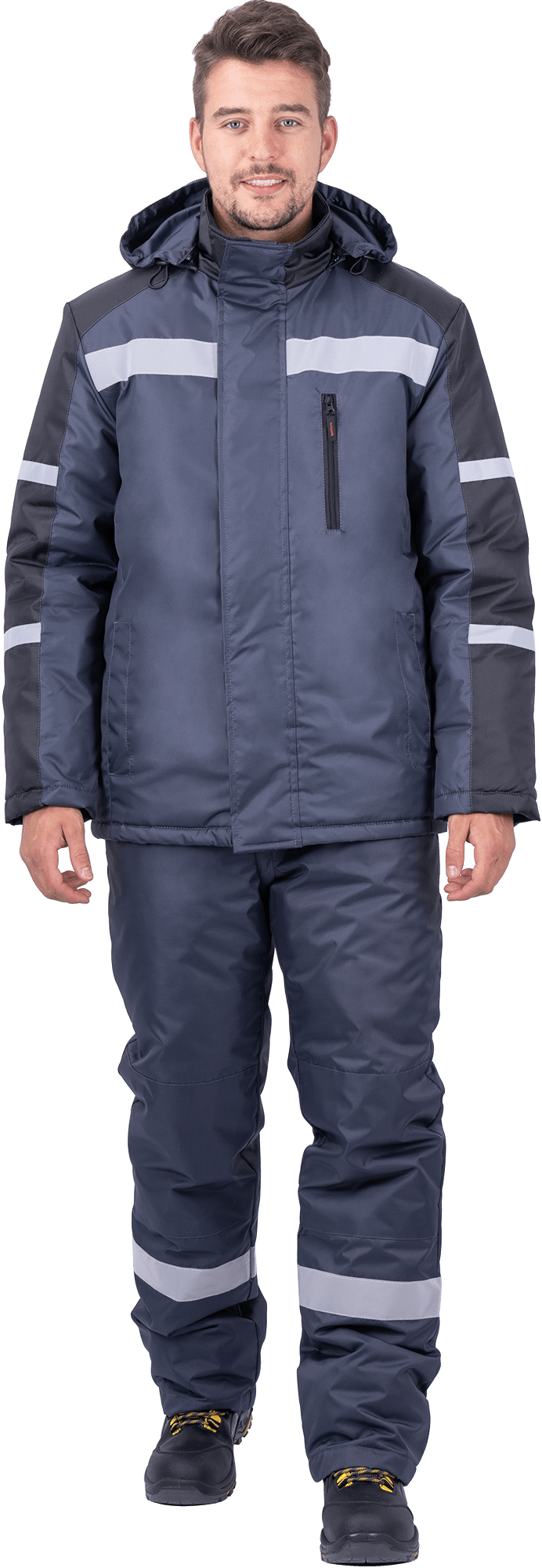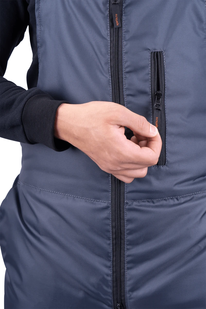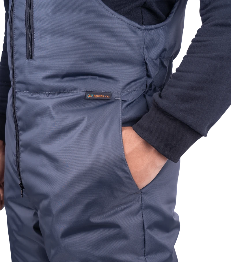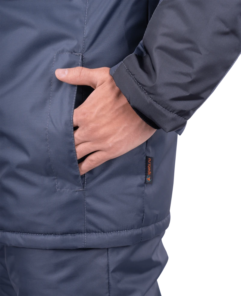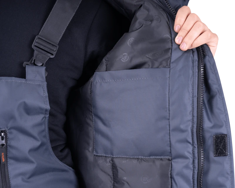 Ткань верха: «Оксфорд 240Т», PU-отделка Состав: 100% полиэфир, плотность 130 г/м² ТР ТС 019/2011 ГОСТ 12.4.303-2016 Защитные свойства: Тн - от пониженных температур воздуха и ветра, (1-2 класс защиты, I-II, III климатический пояс) Мп - от механических воздействий (прокол/порез) Ми - защита от механических воздействий (истираний) З - защита от общих производственных загрязнений Костюм состоит из куртки и полукомбинезона. Куртка: • центральная застежка на молнию • ветрозащитная планка с текстильной застежкой • воротник-стойка • нагрудный карман с застежкой-молнией • нижние карманы с листочкой • внутренний карман • внизу рукава внутренняя трикотажная манжета • пристегивающийся капюшон на молнии с регулировкой объёма • световозвращающие полосы по линии кокетки полочки, спинки шириной 50 мм, по рукавам – 25 мм Полукомбинезон: • застёжка на двухзамковую молнию • бретели с эластичной тесьмой и с застёжкой на фастексы • объём спинки регулируется по линии талии эластичной лентой • боковые карманы с наклонным вход