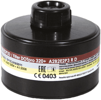 Фильтр комбинированный ДОТпро 320 + А2В2Е2P3 R D в корпусе из композитного материала, предназначен для защиты от органических газов и паров с температурой кипения cвыше 65°С (бензол, ксилол, толуол, бензин, керосин, галоидорганические соединения, анилин, кетоны, тетраэтилсвинец, нитросоединения бензола и его гомологов и т.п.); неорганических газов и паров (хлор, фтор, бром, сероводород, арсины, фосфористый водород и т.п., за исключением монооксида углерода и циана водорода); кислых газов и паров (диоксид серы, хлористый водород, бромистый водород, фтористый водород, пары серной, уксусной, муравьиной, азотной, фосфорной кислот и т.п.); аэрозолей (пыль, дым, туман), в комплекте промышленного фильтрующего противогаза ДОТпро.